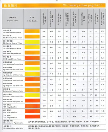 中文名 锌铬黄 英文名 pentazinc chromate octahydroxide 别 称 C.I.颜料黄36; 铬酸锌; 锌铬黄; 铬黄; 锌黄 水溶性 微溶于水 外 观 淡黄色或中黄色粉末铅铬黄性质:又称颜料黄34。主要成分为铬酸铅的颜料,其化学组成为PbCrO4,含量约为90%~94%,外观为浅红黄色粉末,为单斜晶形,密度为5.1~6.0g/cm3,吸油量为13~27g/100g,抗色渗性极好,遮盖力居于浅铬黄和深铬黄之间,明度与浅铬黄相等,优于深铬黄,耐酸性与浅铬黄相等,优于深铬黄,耐碱性差,分散性好。中铬黄是以硝酸盐如硝酸铅、铬酸盐如重铬酸钠为原料,严格控制各种反应条件形成稳定的单斜晶形中铬黄粒子,经过滤、干燥、粉碎而成。主要用于涂料,尤其是路标涂料、油墨和塑料等。